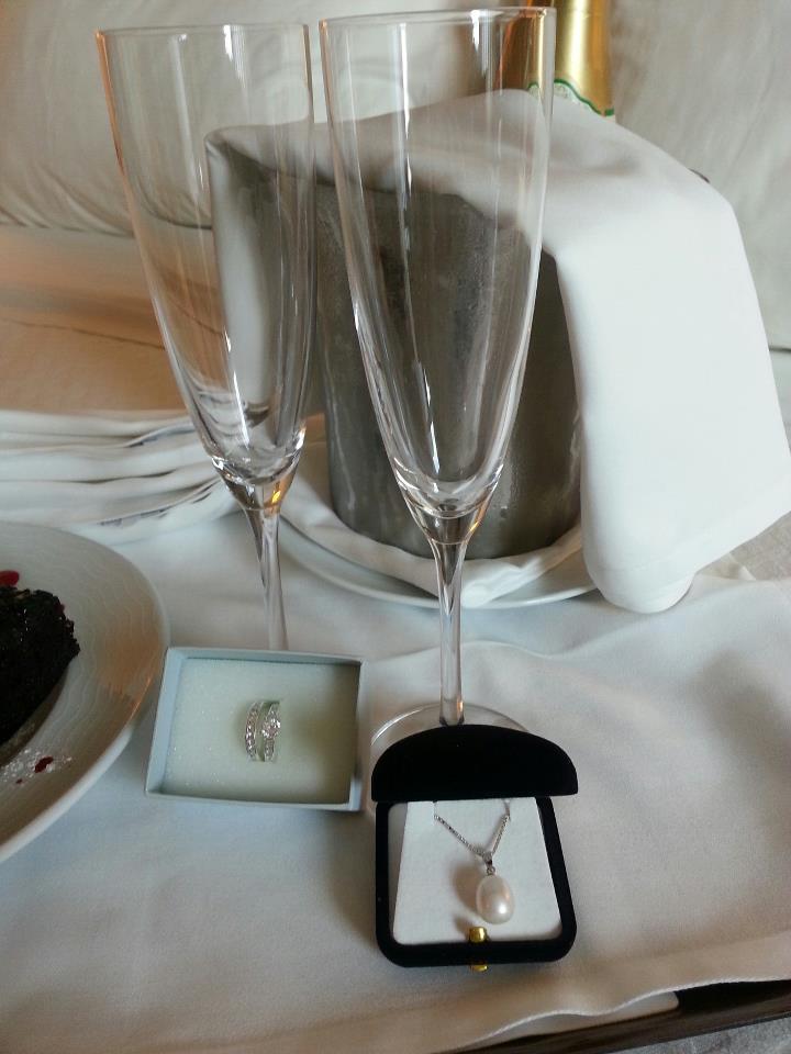 Champ with Swarovski crystal rings and pearl necklase awaits me...
